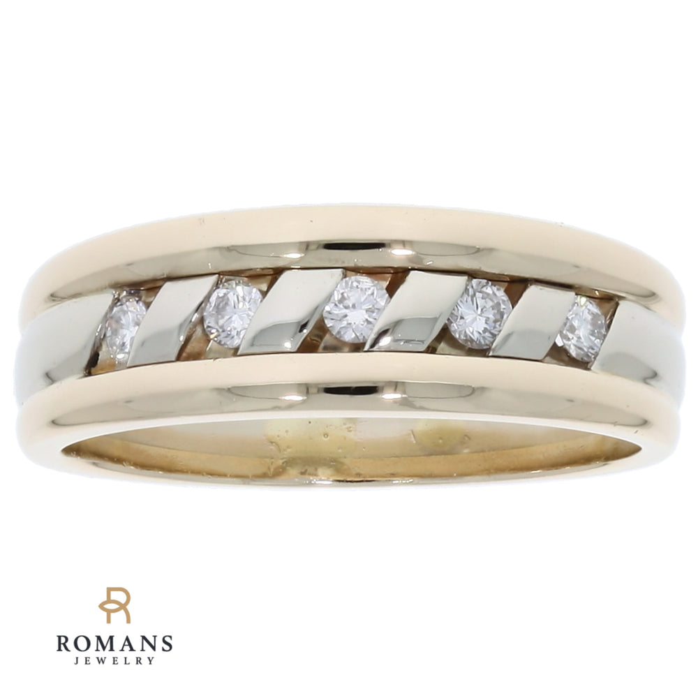 Make your love resonate with this 14k two-tone gold wedding band, showcasing a modern high polish finish and five brilliant diamonds.
