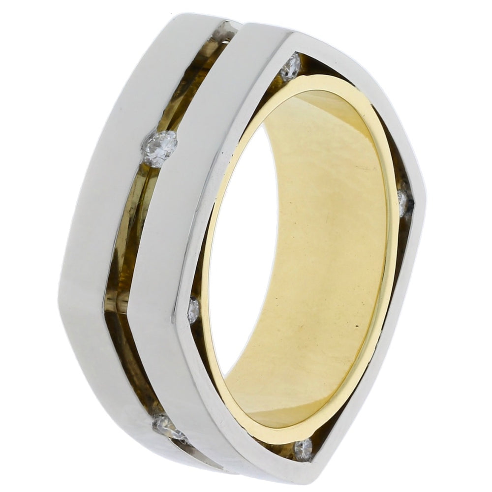This wedding band features twelve flush set diamond accents in 18k yellow gold and platinum square setting. The polish finish adds to the modern look of this men's wedding ring. CAN NOT BE SIZED.