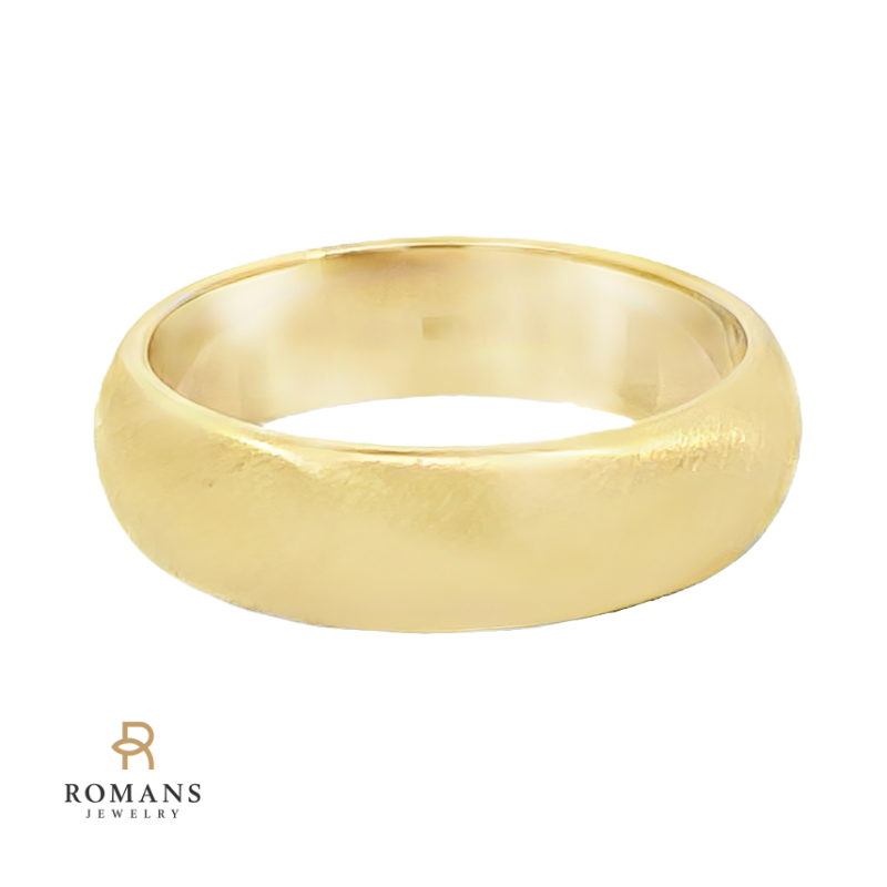 This timeless men’s band is crafted in luxurious 14K yellow gold with a smooth 5.6mm satin finish, offering a sleek and refined look. The satin texture adds a modern touch to the classic design, making it the perfect choice for a wedding band or a stylish everyday accessory. Its understated elegance ensures it complements any personal style. Current Size 7.5