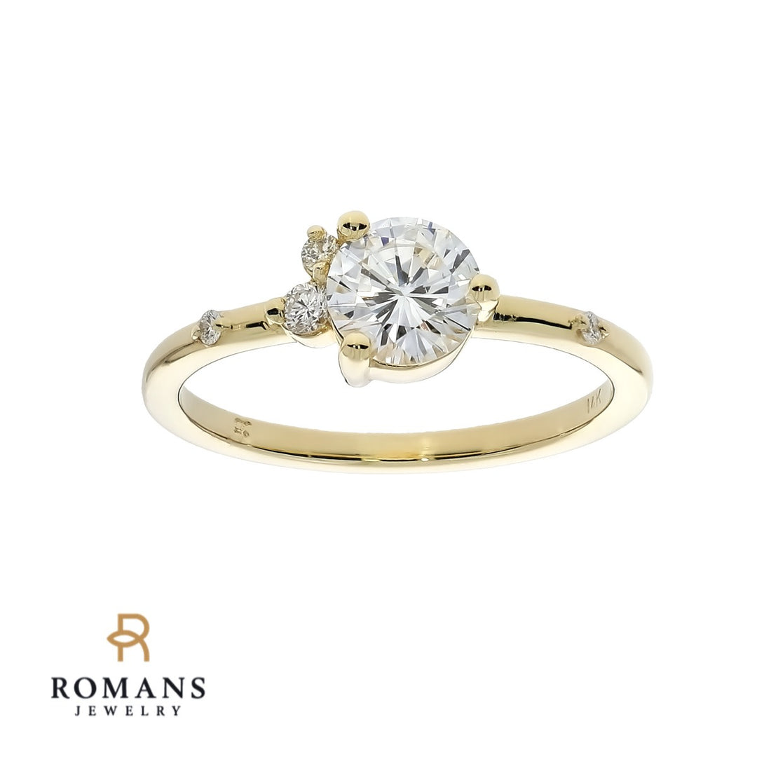 An gorgeous 14k yellow gold engagement ring is adorned with prong-set diamonds spaced elegantly with two diamonds at the side of the main center diamond for a sophisticated and alluring look.